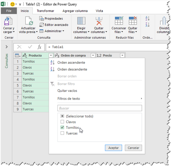 En el próximo paso abrimos la consulta Tabla1 en el editor y aplicamos el filtro a la columna Producto con el valor Tornillo